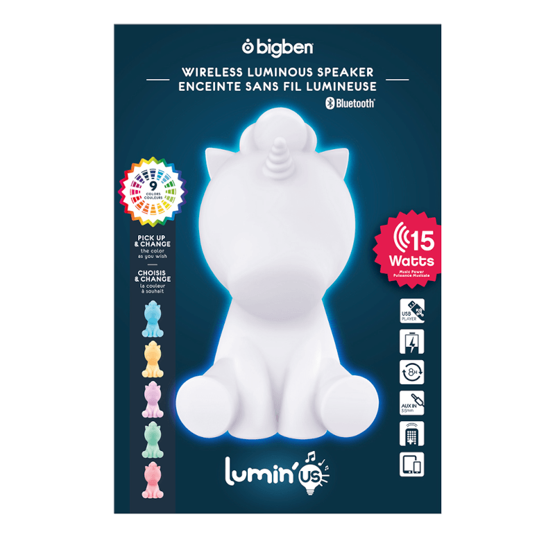 Głośnik Bigben Jednorożec może się mienić barwami. Dołączonym do zestawu pilotem jednym przyciskiem wybierzesz kolor i intensywność podświetlenia. Dopasuj oświetlenie do wnętrza lub pory dnia. Głośnik Bigben Jednorożec nie tylko przyjemnie gra, lecz także cieszy swoim uroczym kształtem i wielokolorowym podświetleniem.