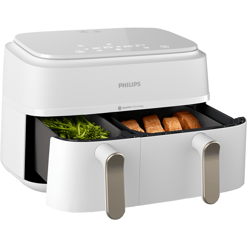 • Dzięki technologii Rapid Air, frytownica zapewnia równomierne pieczenie potraw, gwarantując chrupiącą i delikatną teksturę. Unikalna konstrukcja zapewnia optymalną cyrkulację powietrza, co sprawia, że każde danie jest idealnie przygotowane. Frytownica wyposażona jest w dwie szuflady o różnych rozmiarach, co pozwala na jednoczesne przygotowanie głównego dania oraz dodatków. Dzięki temu można w jednym czasie przygotować pełny, zbilansowany posiłek.
