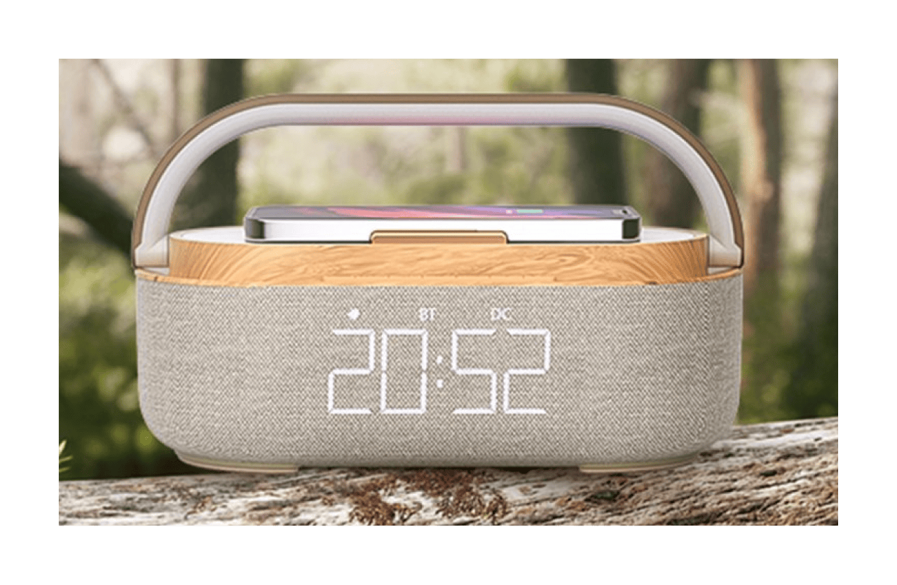 • Ten elegancki głośnik Bluetooth to prawdziwy multifunkcjonalny gadżet, którego możesz używać zarówno w pomieszczeniach, jak i na zewnątrz. Oprócz funkcji głośnika bezprzewodowego sprawdza się także jako radio FM, budzik, lampka nocna oraz szybka ładowarka bezprzewodowa. Dzięki głośnikowi możesz cieszyć się ulubioną muzyką, gdziekolwiek jesteś