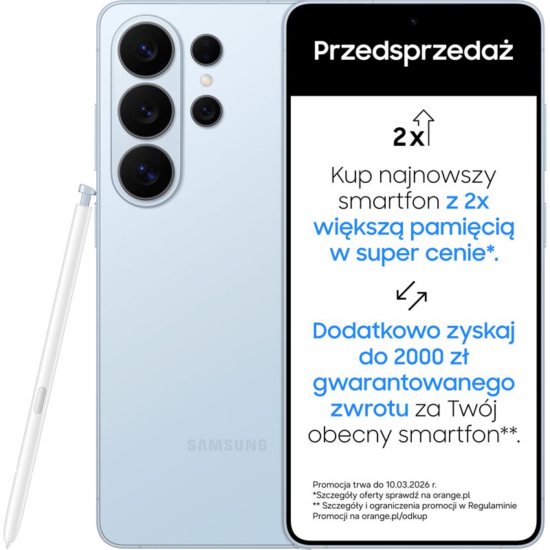 *Kwoty i modele odkupu ustala Organizator Programu Odkup - Breezy Poland. Zależą od modelu i stanu sprzedawanego urządzenia. 2000 zł (w formie elektronicznych bonów płatniczych) to minimalna kwota jaką otrzymasz przy odkupie Samsung Galaxy S24 Ultra (w każdej wersji pamięciowej) w stanie dobrym, bardzo dobrym, idealnym oraz przy zakupie nowego urządzenia z serii Samsung Galaxy S26 w terminie 25.02.2026 do 10.03.2026 r.